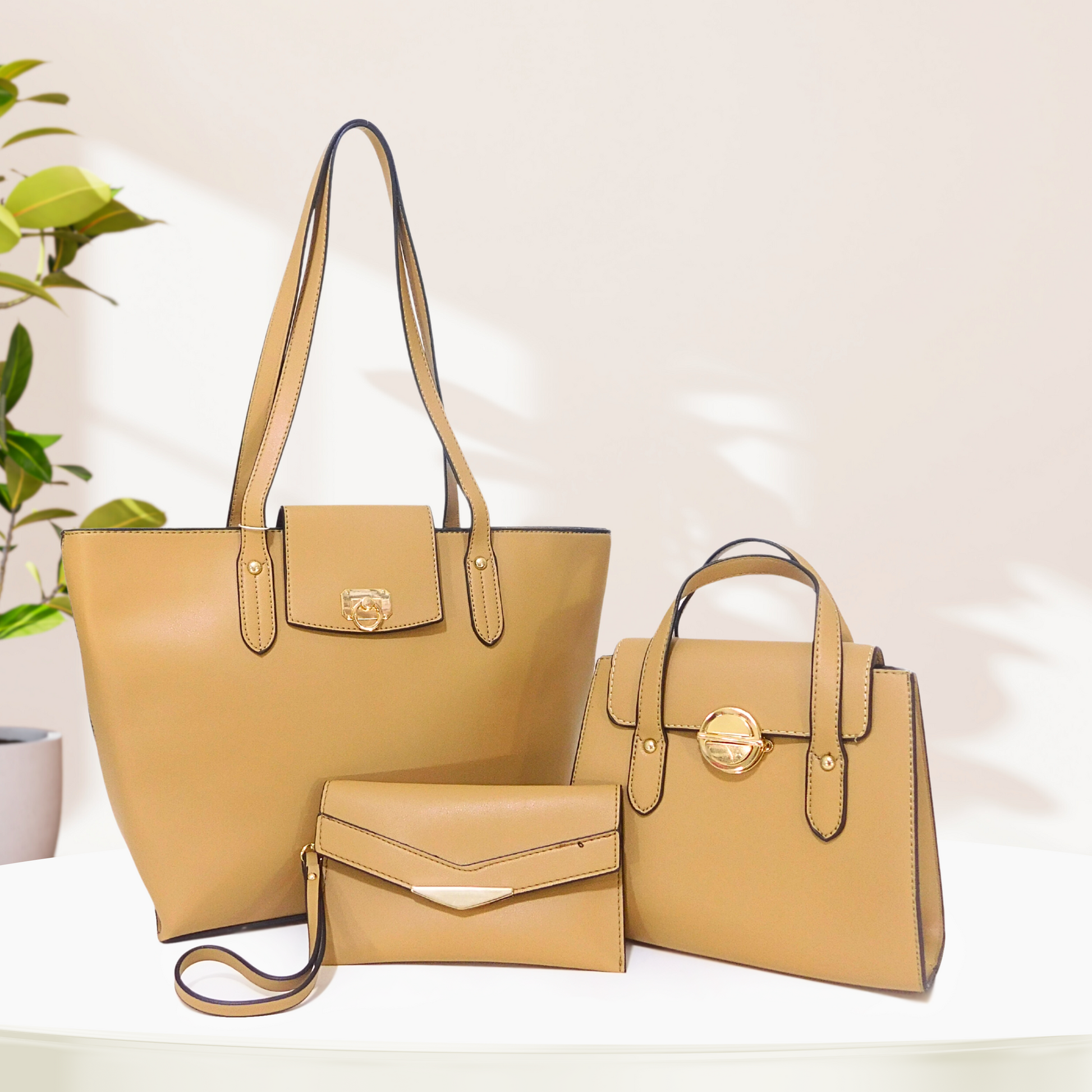 Set de tres piezas en material tipo cuero sintético. Incluye una cartera grande de hombro con cierre de cremallera, un bolso pequeño tipo top handle y una cartera pequeña tipo sobre. La cartera principal tiene interior amplio con un bolsillo con cierre y otro abierto.